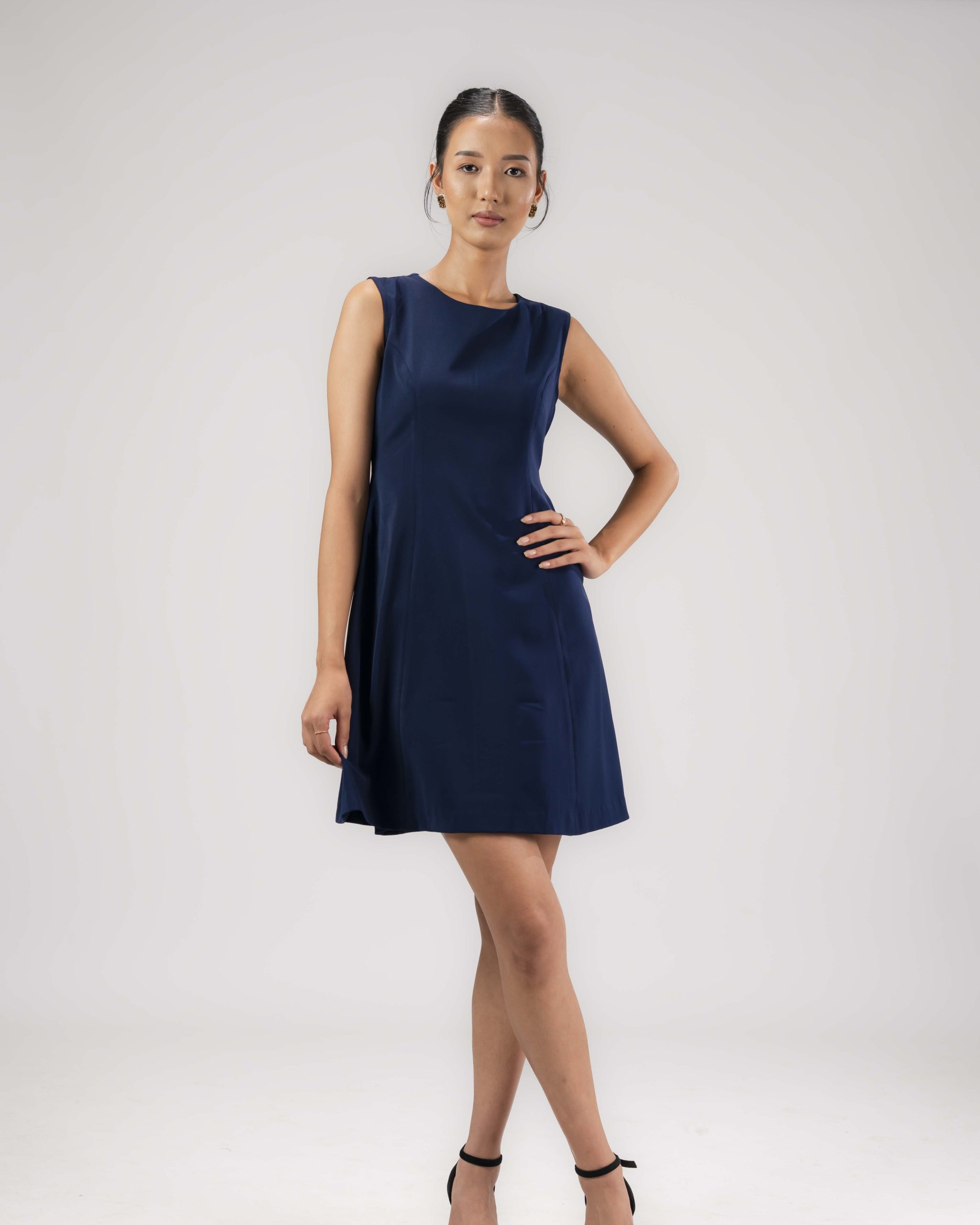 Step out in timeless elegance with this Navy Blue Velvet A-Line Sleeveless Dress, designed to flatter every silhouette. Featuring a classic round neckline and luxurious velvet fabric, this dress offers a soft touch and a rich, sophisticated look. The A-line shape creates a graceful flow, perfect for parties, formal occasions, or evening events. With its deep navy blue hue and sleeveless design, this dress delivers effortless style and comfort for every season.